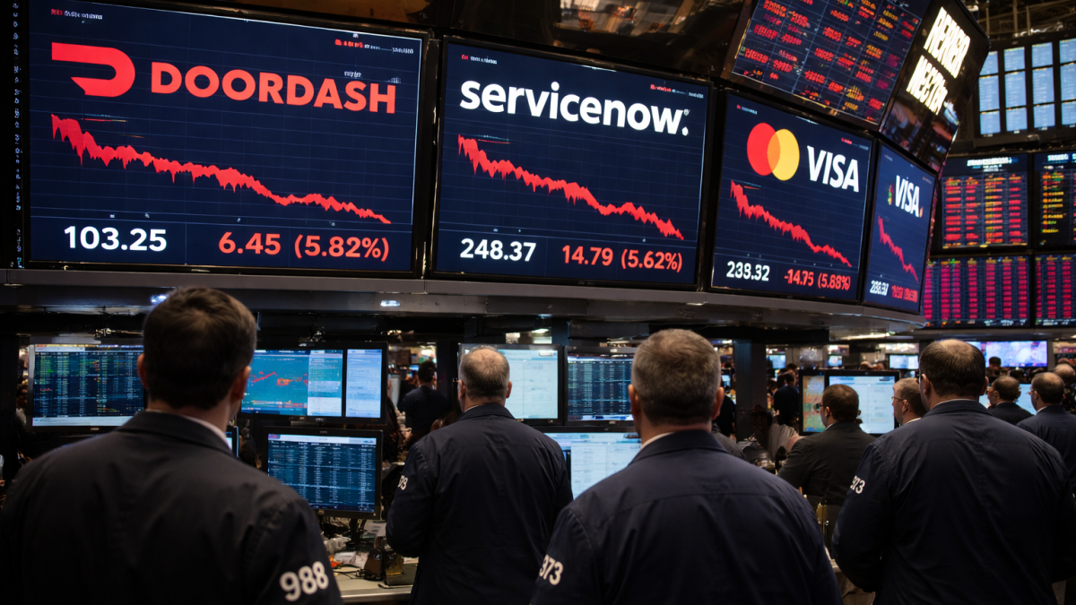 By early afternoon in New York, Visa was down nearly 4.5%, Mastercard had slid 6.3%, ServiceNow was lower by about 4%, and DoorDash had dropped roughly 7%.